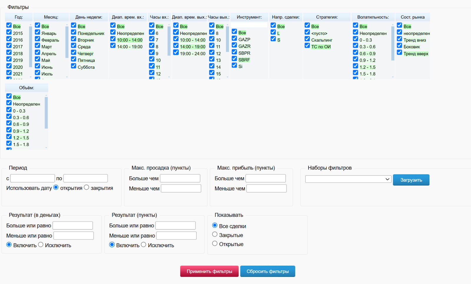 Автор курсов трейдер Вятский приводит и более точную статистику. В ней можно использовать разного рода фильтры — по году, месяцу и даже дню недели. При проверке можно устанавливать стратегию, волатильность, инструмент, состояние рынка и т. д. После применения настроек появляется страница с подробными сводными данными.