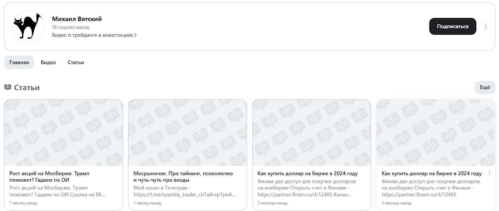 Для продвижения собственного профиля и услуг автор активно продвигает проекты в социальных сетях. В частности, его профиль Михаил Вятский в Дзене представляет много видео о трейдинге и инвестициях. Правда, новые ролики добавляются редко, а количество подписчиков всего 18 человек.