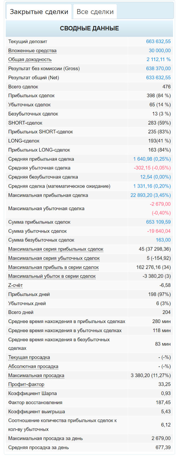 По таблице видно, что общая доходность автора составила 2 112,11%, а число прибыльных сделок превысило 84%. Максимальная просадка за сутки была 2679. Все сведения приводятся как для закрытых, так и для открытых сделок.