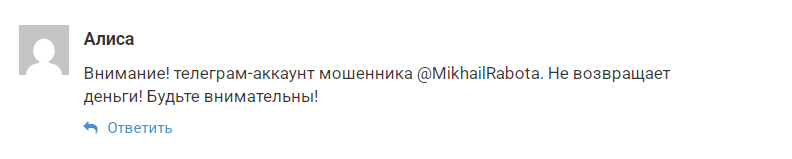 К сожалению, отзывов о ТГ-канале MikhailRabota в Интернете мало. Вероятно, аферист недавно начал свою деятельность. Пользователь по имени Алиса в своем комментарии предупреждает других читателей, что это мошенник, который ворует у людей деньги.