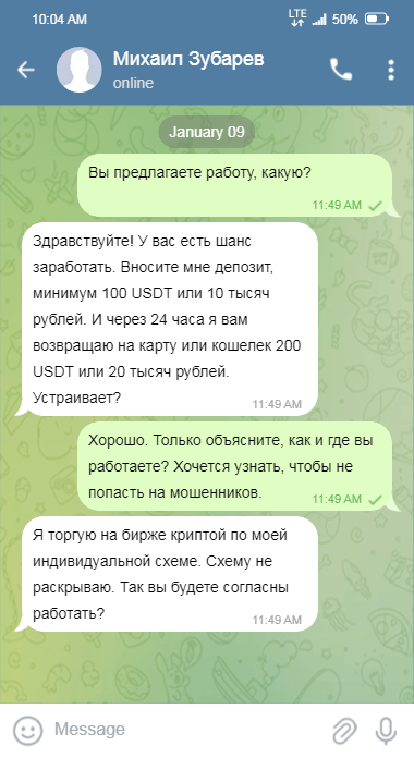 Аферист рекламирует свои услуги в тематических чатах и на форумах. Михаил Зубарев утверждает, что занимается трейдингом и является профессионалом в этом деле. Желающим работать с ним он предлагает написать ему в личные сообщения. В личке он продолжает разводить жертву, требуя перевести на его реквизиты минимальный депозит 100 USDT или 10 тыс. руб., которые он удвоит в течение суток.