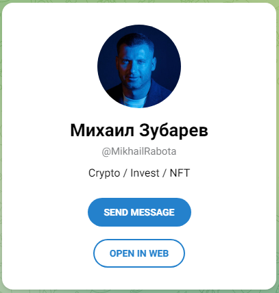 Владельцем аккаунта является некий Михаил Зубарев, настоящее это имя или нет — неизвестно. В описании сказано, что он занимается криптой, инвестициями и NFT.