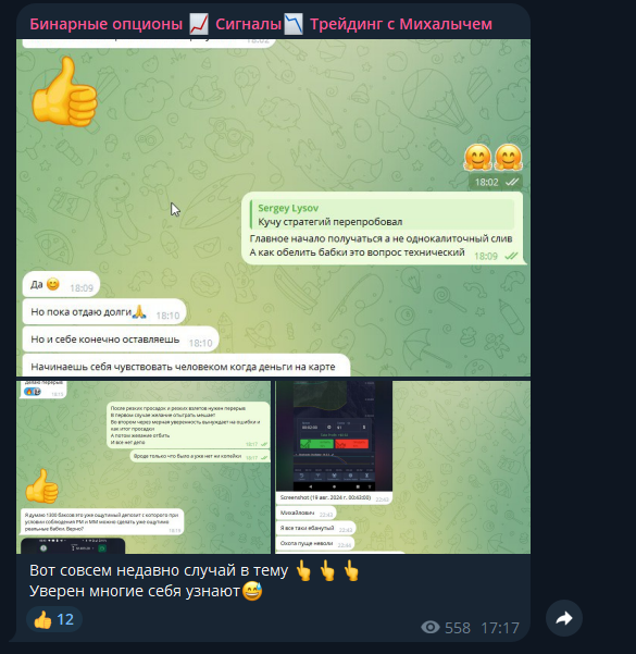 Также часто здесь размещаются диалоги с подписчиками, которые торгуют по стратегиям Михалыча. Часто эти переписки напоминают общение с людьми, которые играют в казино, а не занимаются надежным инвестированием. Пользователи нередко упоминают свои проигрыши, но в конце добавляют, что сейчас якобы все “идет в гору”.