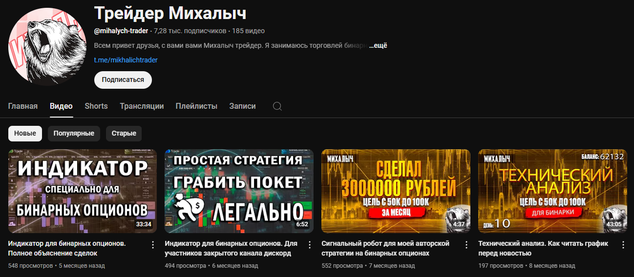 Mikhalichtrader также имеет канал на YouTube, где подписчиков уже в разы больше – около 7000, однако они, похоже, накручены. Иначе сложно объяснить, почему на роликах обычно видны 100-500 просмотров, а публикуются они раз в несколько месяцев. С последнего, кстати, уже прошло почти полгода.
