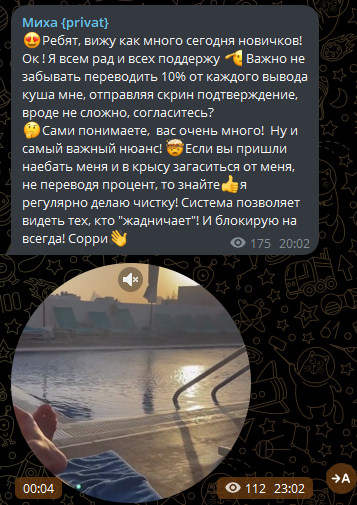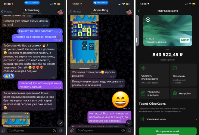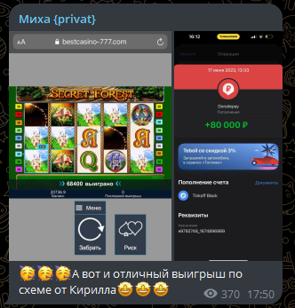 Михаил Смирнов – ТГК со схемами выигрыша в играх, характерными для мошенника. В своей группе в Телеграме Миха{privat}автор публикует якобы рабочие инструкции заработка в онлайн-казино. Размер выигрыша – до 100 тысяч рублей. Но отзывы независимых пользователей о Mikhail Privat говорят об обратном – о слитых депозитах и больших финансовых потерях.