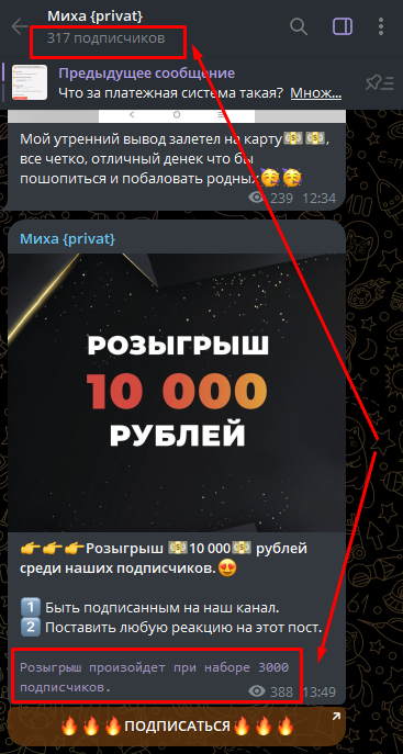 Чтобы привлечь больше клиентов, Михаил проводит розыгрыши и обещает денежные призы. Условия простые – надо подписаться на канал и поставить знак любой реакции на пост. Но ниже есть примечание, что розыгрыш состоится только при достижении числа подписчиков в 3 тысячи человек. Сейчас на канале всего 317 пользователей.