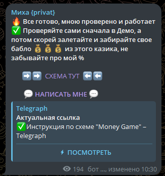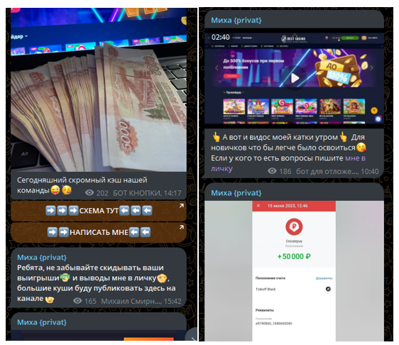 Схема работы очень простая. Михаил регулярно публикует новые алгоритмы для игр на различных сайтах онлайн казино и БК. Сразу же он прилагает фото якобы успешных сессий, демонстрирует пачки наличных. Подписчикам предлагается сразу писать ему в личку для получения инструкций или сначала пройти регистрацию по реферальной ссылке.