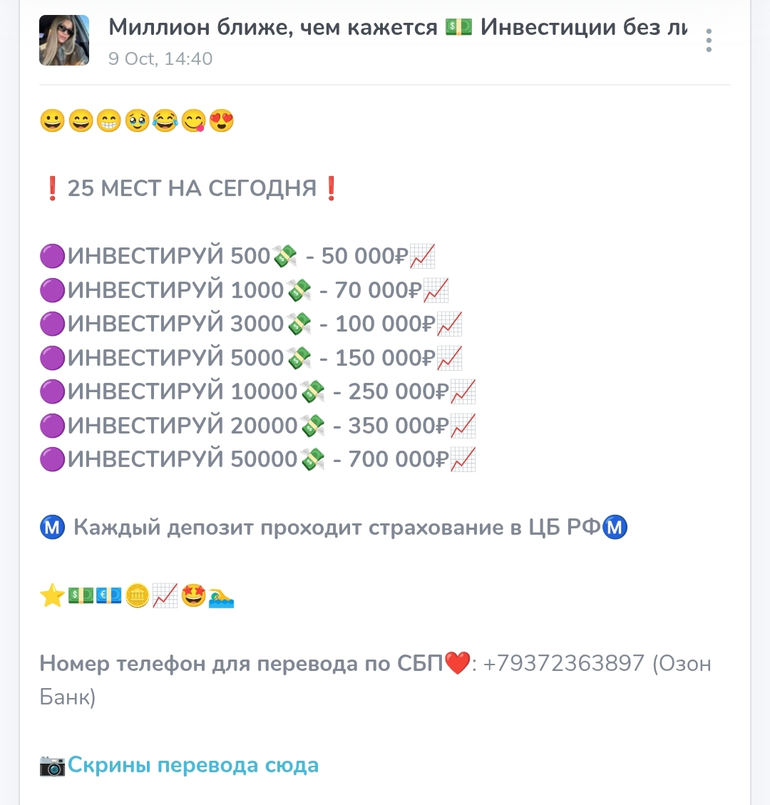 На самом деле, эта схема называется разгон депозита и используется многими аферистами для развода начинающих инвесторов. Средства клиентов просто присваиваются злоумышленниками. В сети есть сведения, что ранее Lisaksdadkas уже была уличена в мошенничестве. Она вела канал Лёгкий Путь к Миллиону Стабильные Инвестиции с аналогичным содержанием. После многочисленных жалоб клиентов, проект был закрыт, а точнее переехал на новую площадку.