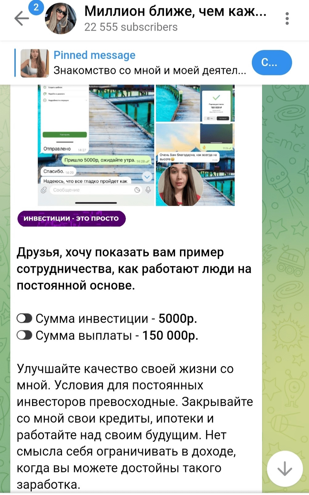 У большинства начинающих инвесторов нет времени на изучение рынка. Елизавета и проект Миллион Ближе Чем Кажется предлагают заработать новичкам без опыта и с минимальными вложениями. Схема простая: клиент перечисляет средства на счет, указанный администратором, а на следующий день получает сумму в десятки раз превышающую первоначальный взнос.