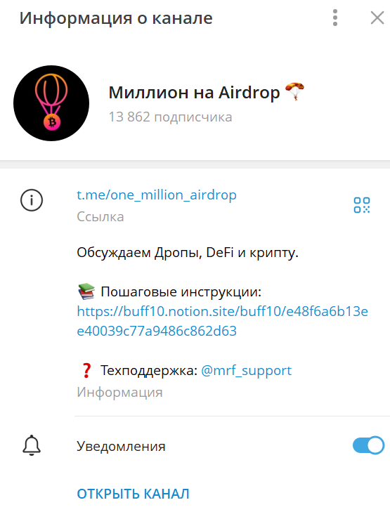 Канал «Миллион на Airdrop» был создан для заработка на airdrop. Его контент ориентирован как на новичков, так и на опытных пользователей. Основатели канала – Алик и Иван. Известны как сооснователи эксперимента «10$ Баффетта». Это добавляет им некоторую репутацию в криптосообществе.