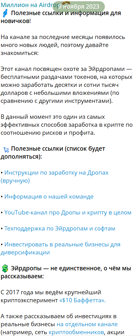 - Помимо аирдропов, канал продвигает инвестиции в бизнес и другие криптоэксперименты.