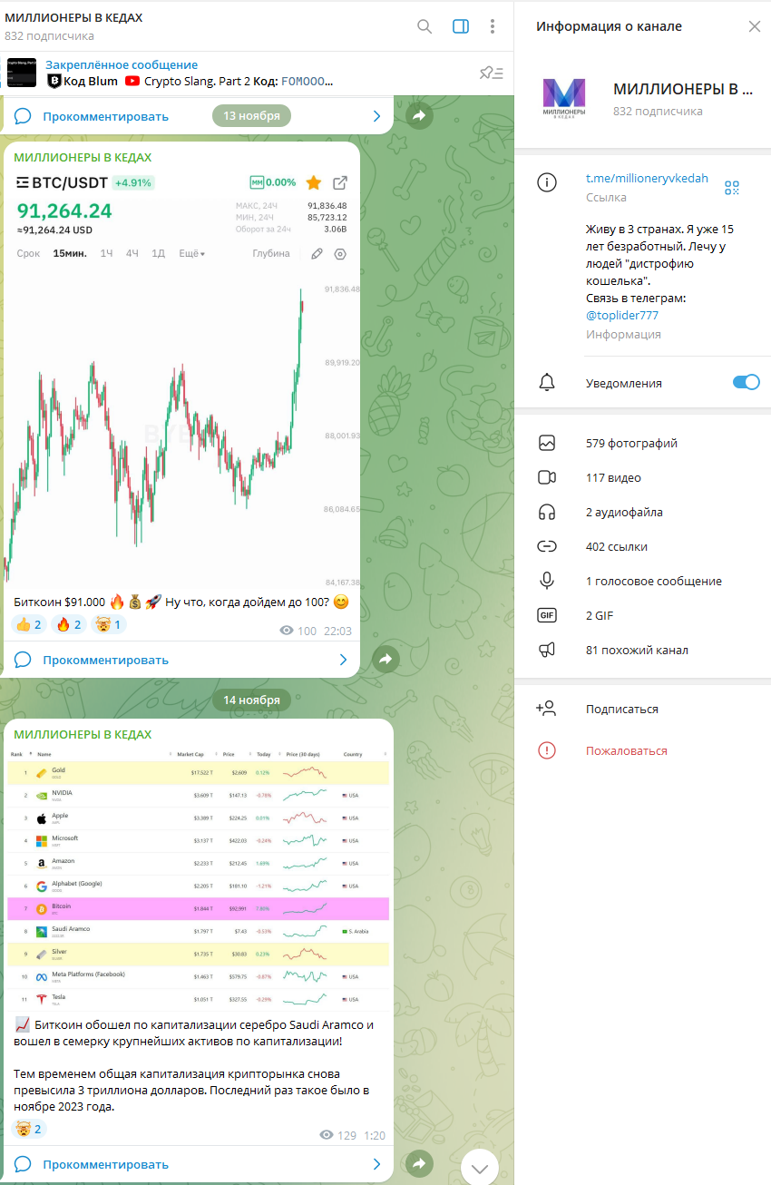Участие в пирамидах, а тем более активные выступления на конференциях мало кого красят. Это лишний раз подтверждает подозрения, что «Миллионеры в кедах» – просто развод и автор ждет момента, чтобы начать привлекать подписчиков в очередную пирамиду.Телеграм-канал создан 2 ноября 2023 года. На момент написания обзора на него подписано 832 человека. Раньше на нем выкладывались какие-то бесполезные материалы в духе «Привычки и секреты успешных людей», но сейчас автор делает упор на копипасту новостей. Сейчас он активно форсит PAWS и новости о том, что BTC побил свой исторический максимум. На этом все. Какой-то пользы или авторского контента, аналитики мы не смогли обнаружить. Чем он собирается «лечить у людей дистрофию кошелька» нам непонятно. Вряд ли новости про одно и тоже в этом хоть как-то помогают.
