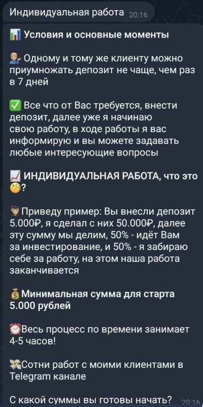 - Эксперт обещает десятикратную прибыль за пару часов, что противоречит базовым принципам финансового рынка и сильно снижает уровень доверия к трейдеру.