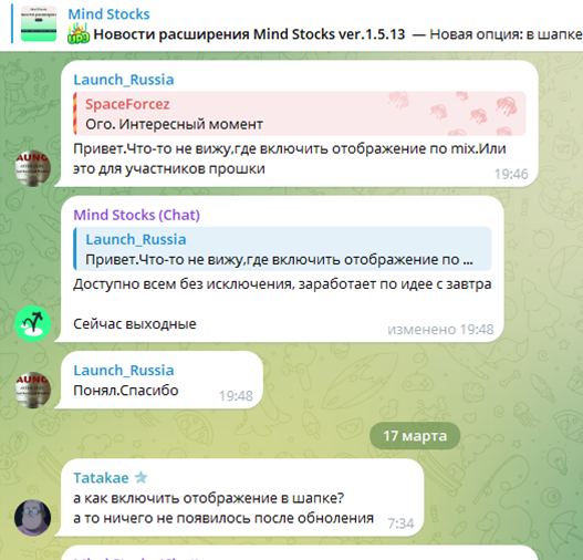 Но важно заметить, что на момент написания статьи, обновляется только канал с обновлениями и новостями самого проекта. Остальные чаты не ведутся с середины 2024 года. Судя по всему, разработчики сфокусировались исключительно на новостях российского фондового рынка и распространении расширения.