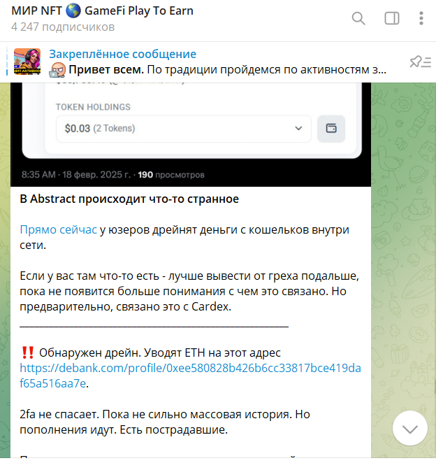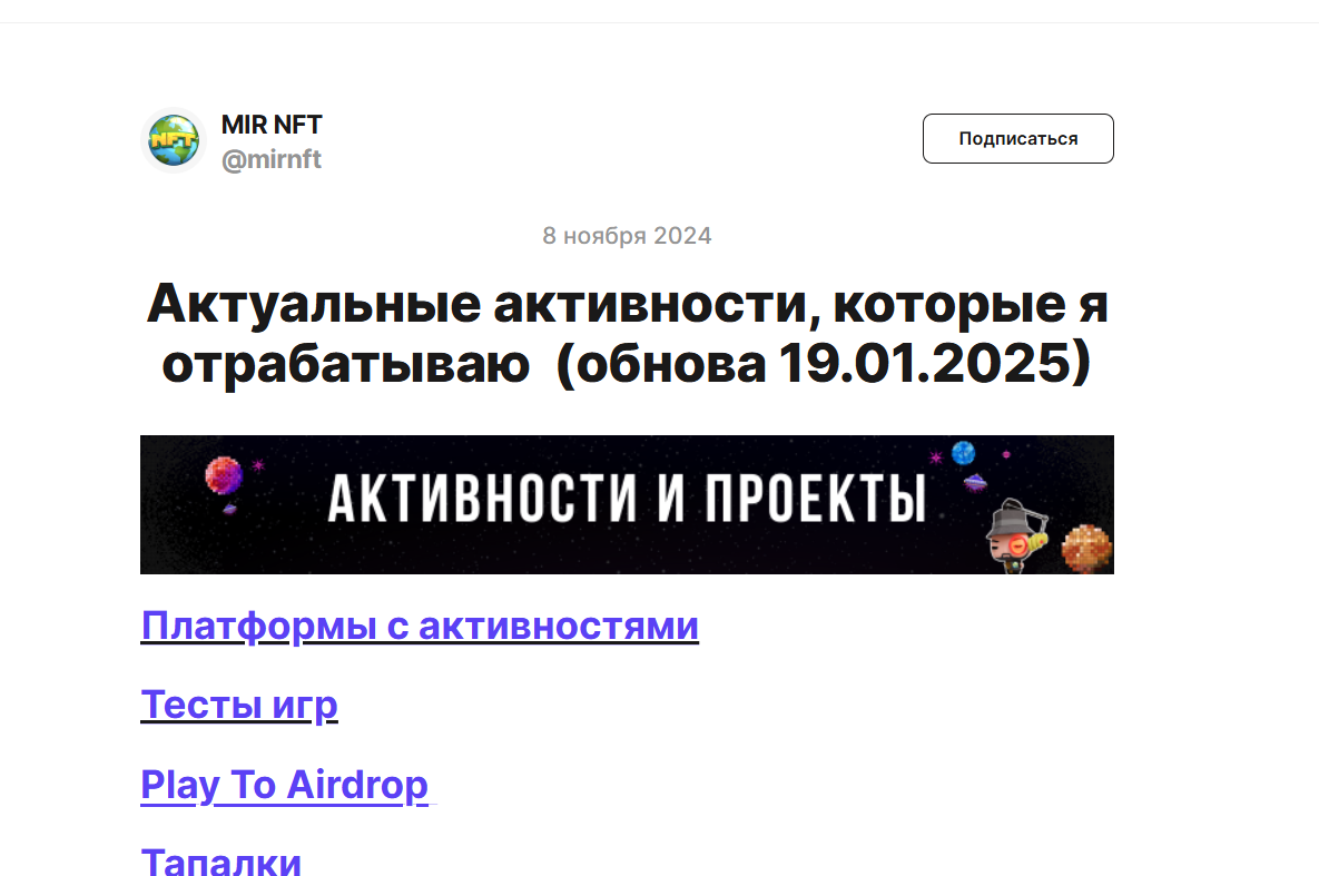 На телеграмм-канал подписано 4371 человек на февраль 2025 года, опубликовано 500 постов с различными играми, приносящими прибыль и ведущими к убытку. Автор профиля «Мир Нфт» рассказывает о хороших играх и тех, на которых воруют деньги с баланса. Его новости обсуждаются, комментируются, а каждый пост собирает от 10 до 30 лайков.