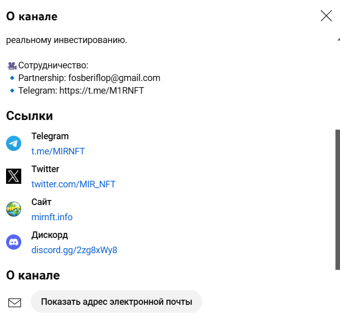 На канале MirNft в Ютубе, администратор проекта рассказывает об актуальных новостях из мира криптовалюты, а также он указывает на то, что не несет ответственности за любую информацию, представленную на канале. Автор профиля просит перепроверять данные, которые он публикует, основываясь на том, что сейчас в мире все быстротечно.
