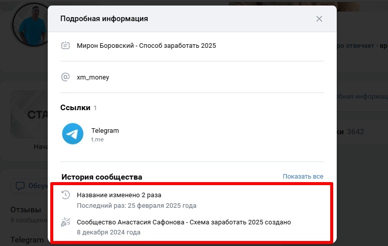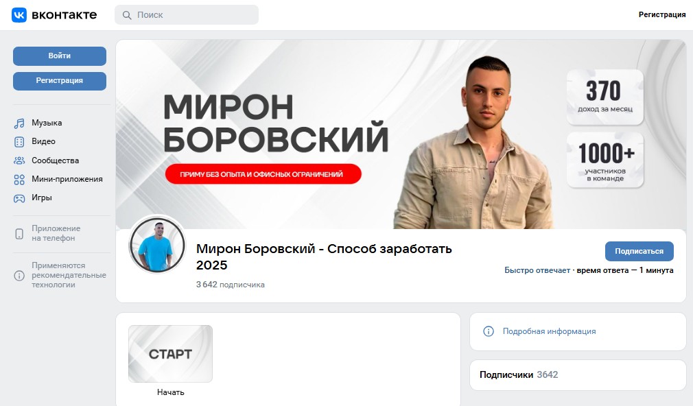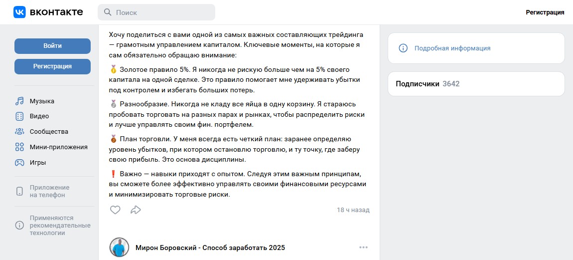 «Мирон Боровский – Способ заработать 2025» – страничка ВКонтакте анонимного трейдера. Кроме имени и фамилии автор не раскрывает информации о себе. И то не факт, что личные данные не выдуманы. Ведь лицензии финансиста админ не опубликовал, других доказательств профессионализма и личности не предоставил. Более того, он взял раскрученный аккаунт «Анастасия Сафонова – Схема заработать 2025», созданный в 8 декабре 2024, и в феврале 2025 сменил название.