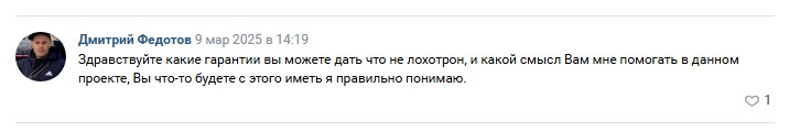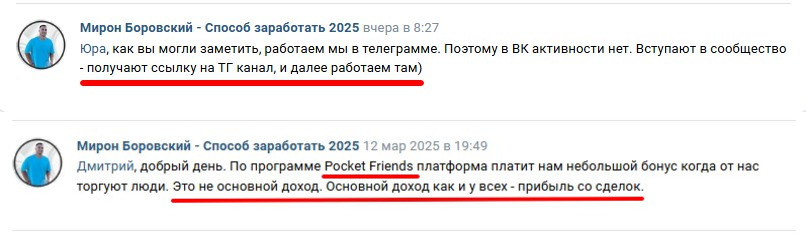Отзывы о «Мирон Боровский способ заработать 2025» в интернете отсутствуют. Зато есть комментарии довольных клиентов ВКонтакте. Хотя не все отклики положительные. В отрицательных высказываниях пользователи говорят, что это мошеннический проект. Люди просят предоставить хоть какие-то гарантии или лично встретиться оффлайн. На это якобы успешный трейдер отвечает, что он зарабатывает процент с прибыльных сделок, а значит, ему нет смысла обманывать. Но это ложь, так как биржи платят и за слив депозита.