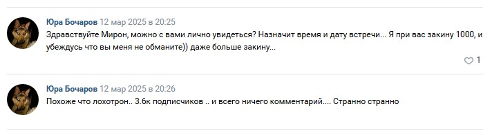 Единственный блог в свободном доступе – это страничка ВКонтакте «Мирон Боровский – Способ заработать 2025». На нее подписаны 3 642 человека, доставшиеся мошеннику от предыдущей владелицы. Это любимый способ аферистов использовать соцсети с историей, чтобы сразу работать с имеющейся аудиторией. При этом под постами нет лайков. А значит, и реально заинтересованных в услугах людей.
