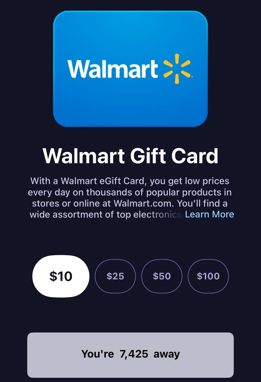 В Mistplay не существует стандартного вывода денег, заработанные очки можно обменять на подарочные карты в разделе Shop. Так, карта Amazon на $10 обойдется игроку в 7,350 внутриигровых токенов, подарочный купон Walmart на ту же сумму – 7,425.