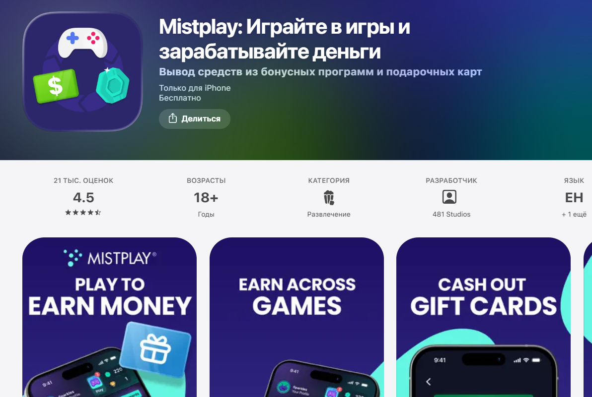 У проекта есть также сайт Mistplay com, на нем указано, что в качестве вознаграждения за прохождение игр можно получить подарочные карты, которые различаются в зависимости от региона. Связаться с поддержкой можно, написав на почту support mistplay com.
