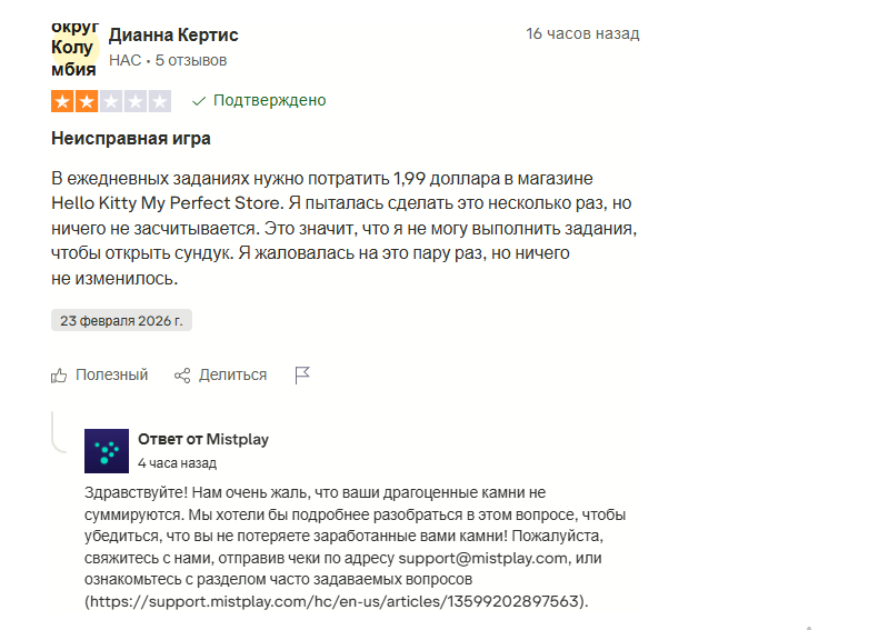 Встречаются и негативные отзывы. Например, в некоторых играх предусмотрены встроенные покупки, без которых выполнить задачи, поставленные Mistplay, вовсе невозможно. Проблема в том, что транзакции могут еще и не засчитываться. Подобные вопросы следует решать через поддержку.