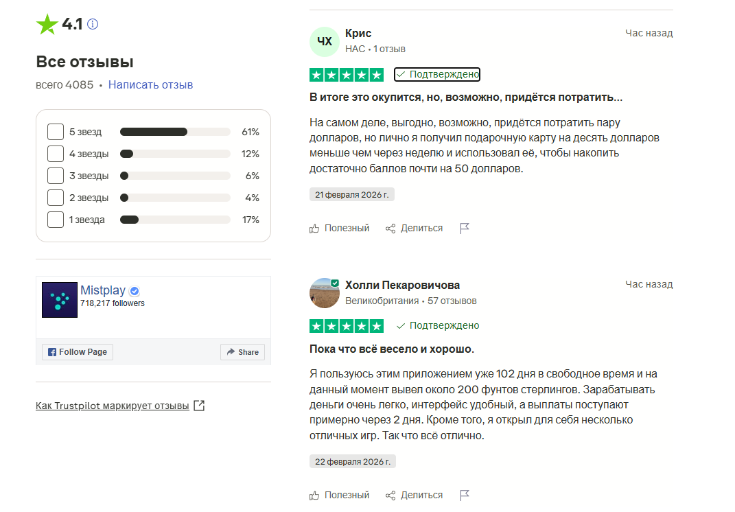 Наиболее показательные отзывы о Mistplay стоит искать на TrustPilot, там репутация сформировалась на основе более 4 000 откликов. Рейтинг – 4.1, в положительном фидбэке люди отмечают возможность накопить на подарочную карту всего за неделю игры. Также некоторые юзеры в качестве позитивного момента отмечают знакомство с новыми интересными играми.