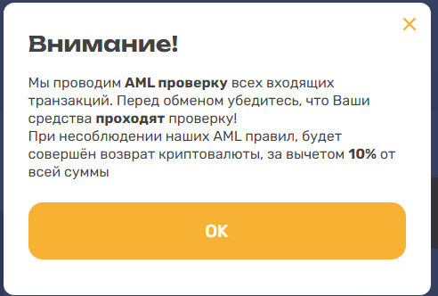 Владельцы сервиса утверждают, что комиссия уже заложена в обменный курс, но предупреждают: в случае негативного результата проверки AML средства будут возвращены с удержанием 10%.
