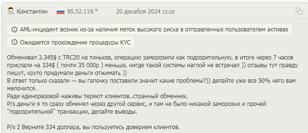 Есть и недовольные клиенты. Константин пожаловался на заморозку транзакции из-за подозрительного кошелька. В итоге деньги были возвращены с удержанием комиссии.