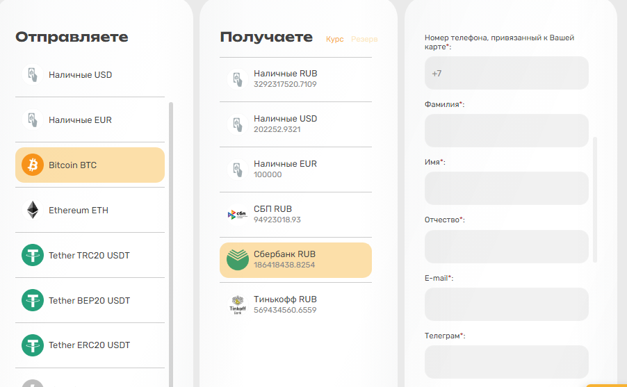 • Криптовалюты: BTC, USDT, LTC, SOL, XMR.