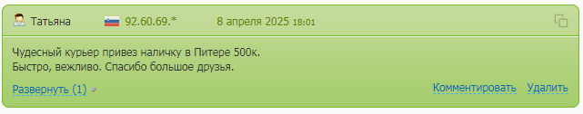 Клиент по имени Татьяна рассказала, что заказывала 500 тыс. руб. наличкой в Питере, отметив в комментарии быстроту доставки денег и вежливость курьера.
