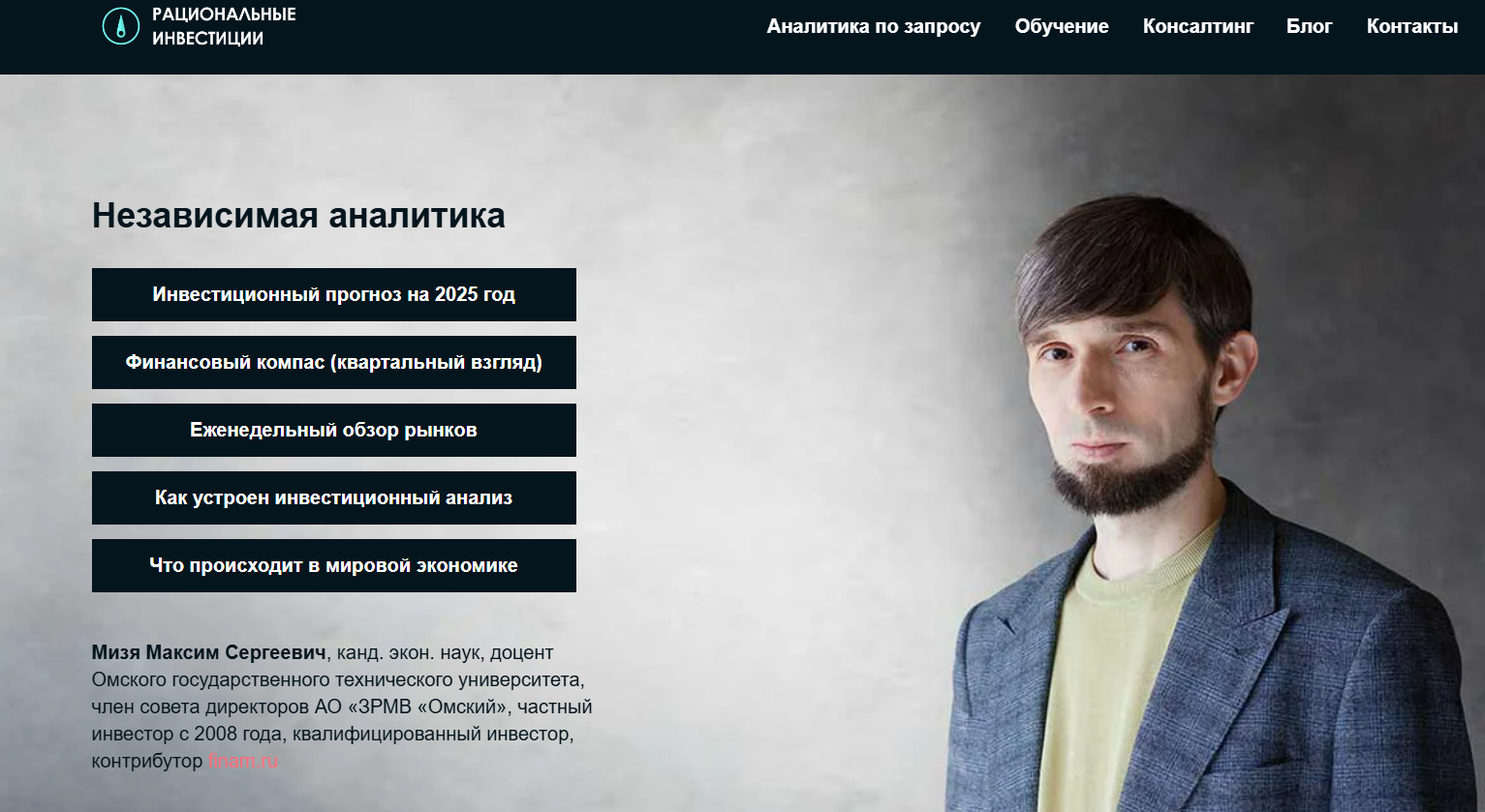 На сайте Мизя Максим описывается кандидатом экономических наук, доцентом, частным инвестором, который работает с 2008 года, а также помощником площадки Finam ru.