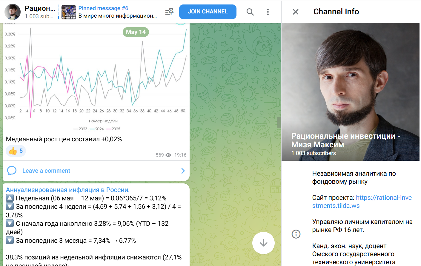 В Телеграмм паблике с аналогичным названием Рациональные инвестиции (@ mizya max) Максим Мизя даёт независимую аналитику по фондовому рынку. В комьюнити состоит около 1000 участников, аудитория является реальной. Комментарии открыты, доступны различные эмодзи. Личный профиль ментора – @ mizyams. Наряду с обзорами рынка появляются анонсы видео на других каналах коуча – YouTube (@ mizya ms), Вконтатке (@ mizyams).