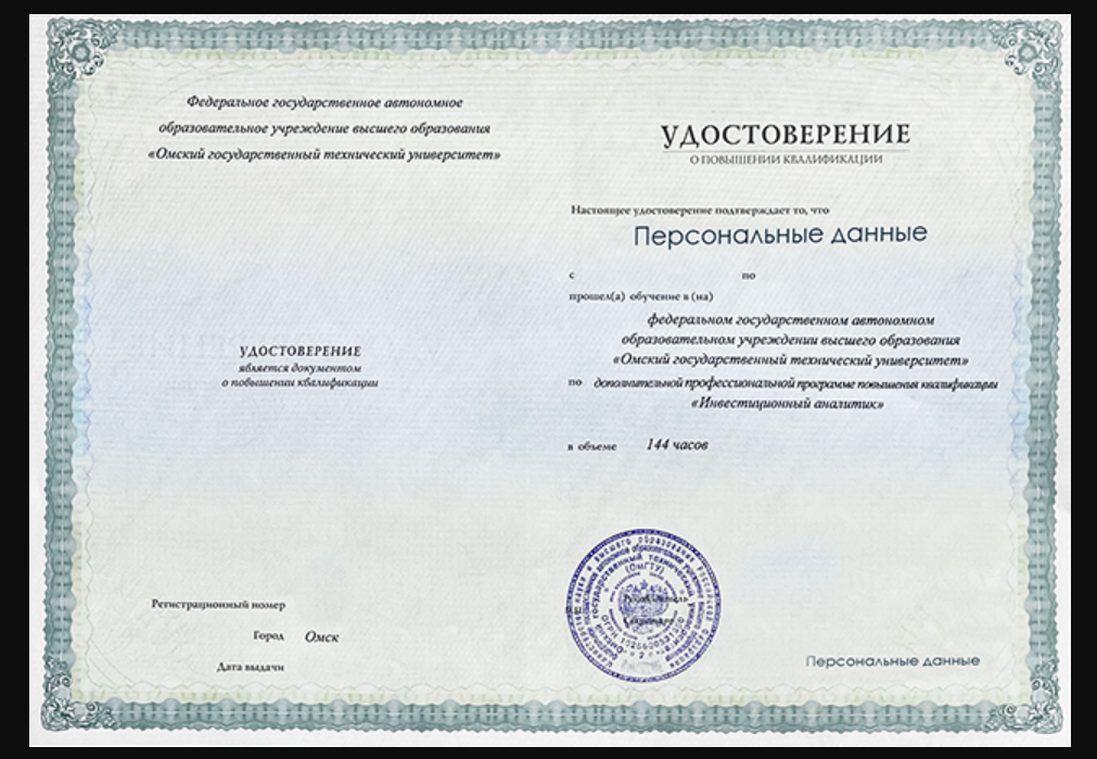 В числе услуг наставника представлен онлайн-курс Инвестиционный аналитик, удостоверение о повышении квалификации выдаёт Омский Политех. Общее время обучения составляет 144 часа.