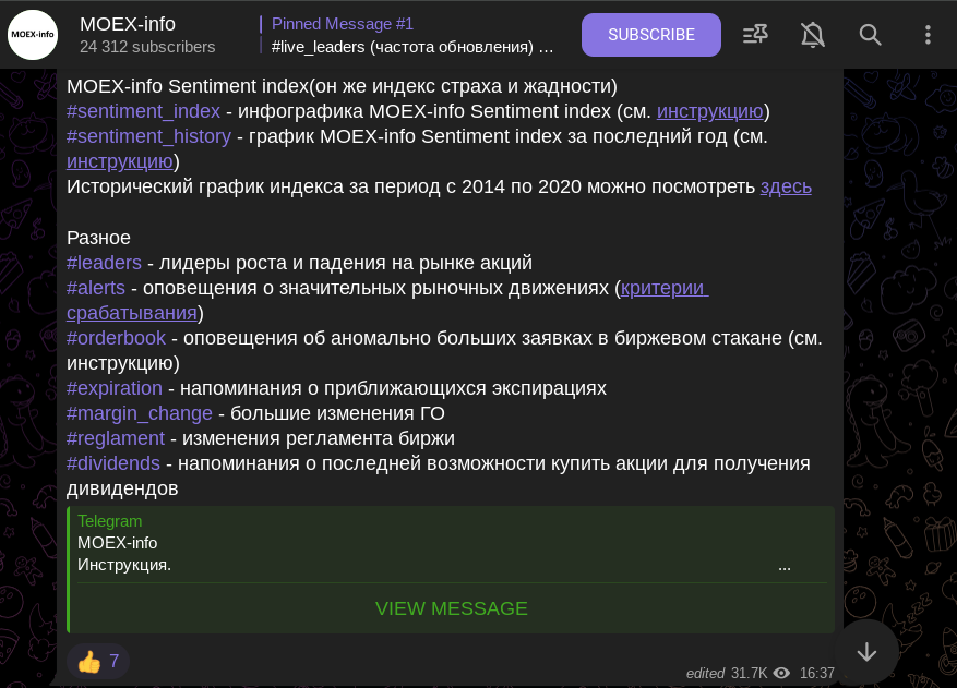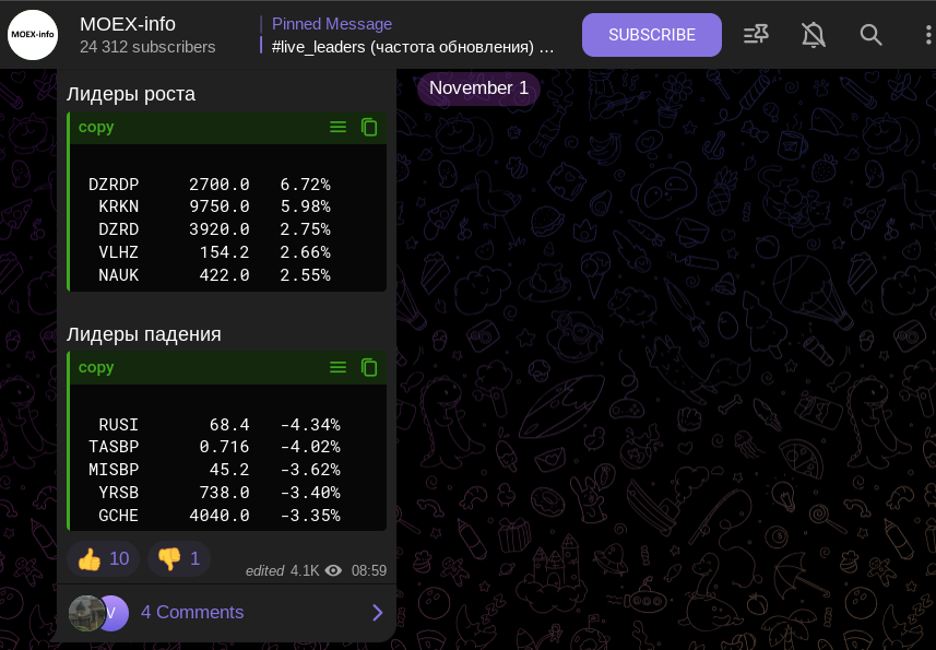 Мы не можем назвать телеграм-канал мошенническим, потому что на нем нет скам рекламы или платных услуг. Но в то же время и не будет рекомендовать паблик. Во-первых, последняя активность в сообществе была 1 ноября. Во-вторых, бот, который публикует выжимку данных с Моссбиржи на MOEX Info, не работает.
