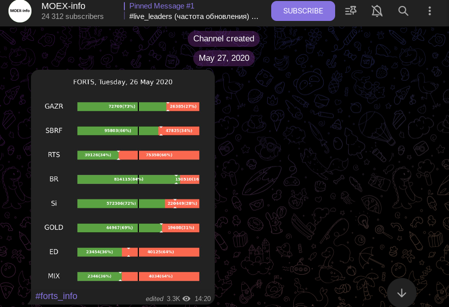 Den Konstantinov публикует торговые сигналы, краткую информацию по активам с Московской Биржи с 8 мая 2020 года. За это время аудитория инвестиционного канала MOEX Info увеличилась до более 24 тысяч человек. Спустя 19 дней после создания проекта появилась публикация с соотношением роста и падения активов в формате FORTS. Информацию, которую разместил Денис, просмотрели свыше 3 тысяч человек.