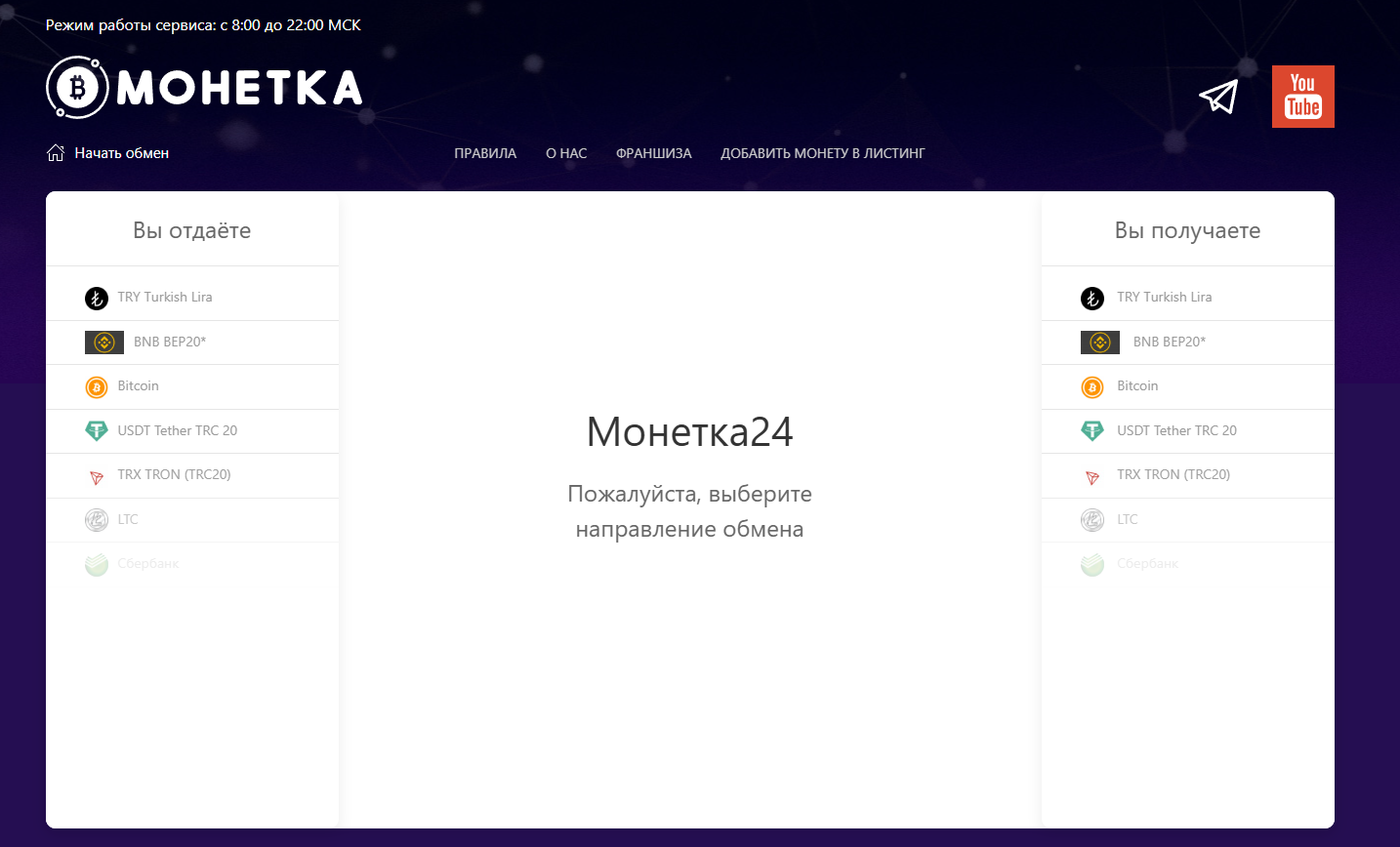 «Монетка 24» – сервис, работающий с криптой и электронными деньгами. Фиат на крипту можно обменять при помощи банковских карт, а также наличных средств. Платформа называет своими плюсами следующее: