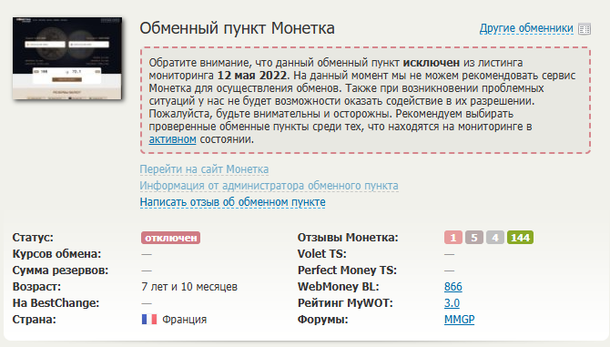 «Монетка 24» присутствует на самых крупных мониторингах, в том числе «КурсЭксперт» и BestChange. Здесь у проекта ранее была хорошая репутация, однако, сервис по каким-то причинам был отключен от листинга в мае 2022 года. С этого момента мониторинги более не рекомендуют пользоваться данной площадкой для обмена. Возможно, обменник вообще прекратил свою деятельность.