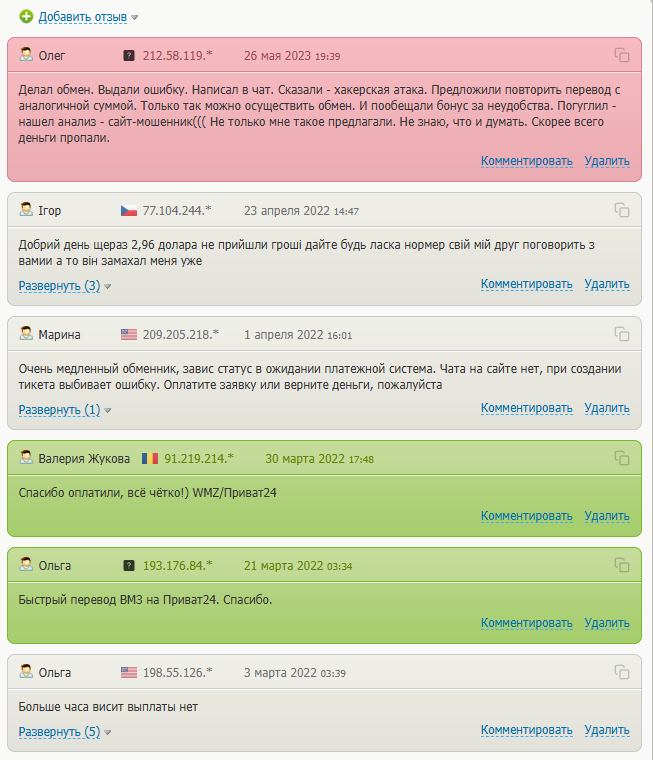 Мониторинги криптообменников содержат множество положительных отзывов о проекте. Очевидно, что сайт долго функционировал и предоставлял качественные услуги. Последние отклики были оставлены в 2023 году. Среди них есть и отрицательные отзывы, однако, положительных намного больше.