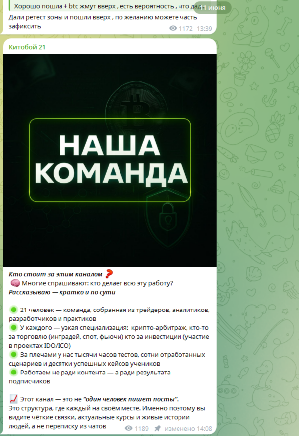 Здесь разработчики рассказали, что за кадром канала «Китобой 21» стоит не одна личность, а целая команда из 21 сотрудника. Все эти люди – профессиональные трейдеры и опытные аналитики. Но ни с одним из них нас знакомить не стали. Демонстрировать какие-то свои кейсы и результаты они тоже не захотели.