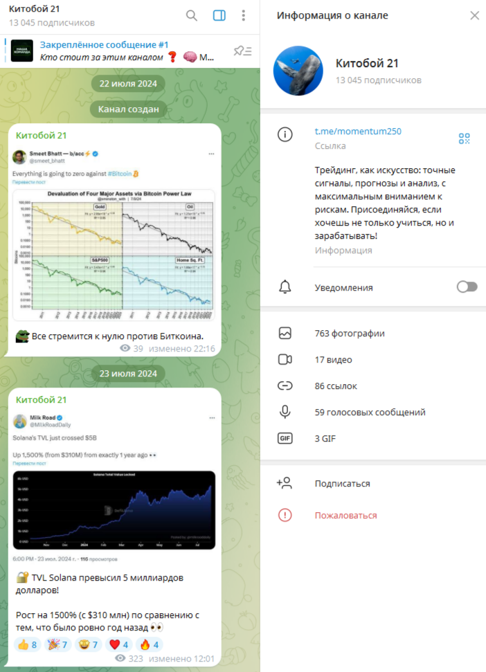 Телеграм-канал «Китобой 21» был создан 22 июля 2024 года. С этого дня автор стал выкладывать тематический контент, посвященной трейдингу и крипте. Странно, что он не стал писать приветственного сообщения и рассказывать, кто стоит за кадром и что здесь ожидает аудиторию.