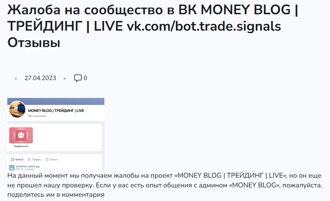 Обзор программы для трейдеров Money Blog: деятельность проекта Bot Trade Signals, отзывы клиентов и проверка паблика в ВК на скам