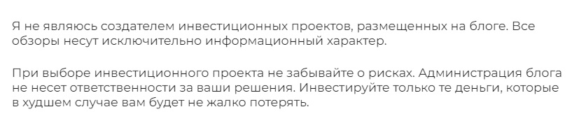 Новички, не обратив внимание на отказ от ответственности, размещенный в подвале блога, делятся негативными отзывами на независимых ресурсах. Артем Сергеевич Dominvestor сообщает, что все риски от инвестиций клиент берет на себя.