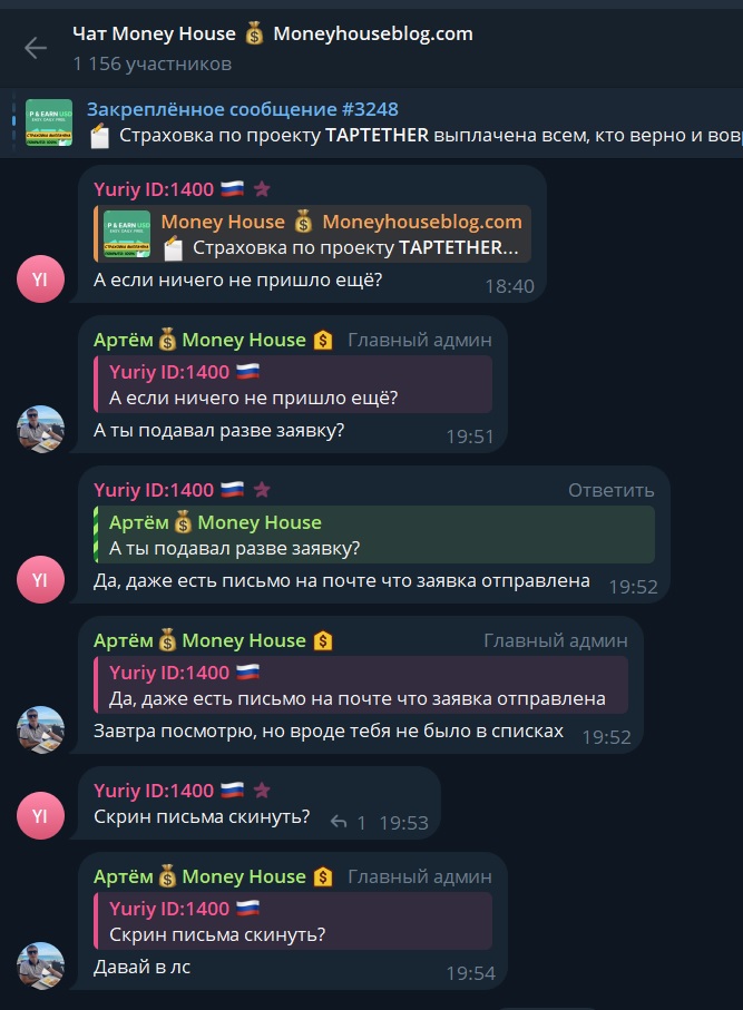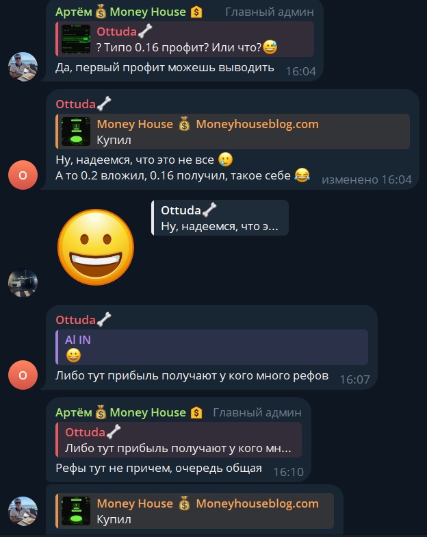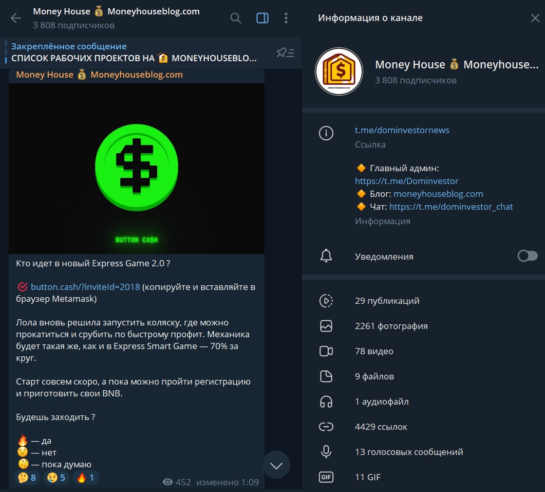 Money House в телеграмме ведет Артем с ником Dominvestor, личность которого не раскрывается. Канал Money House Moneyhouseblog com создан 11 января 2019 года и с первого дня автор обещал только актуальную информацию по проектам, скриншоты с выплатами и другими доказательствами реальной прибыли от инвестиций. К началу августа 2024 года на канал подписаны 3 808 пользователей, но при этом: