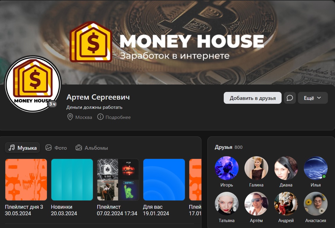 • личный профиль Артём Money House по адресу Dominvestor;