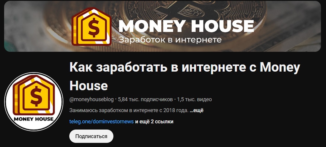 • ютуб каналы Как заработать в интернете с Money House с ником moneyhouseblog с размещенными на нем 1 500 видео для 5 840 зрителей и ДомашнийИнвестор, где для привлечения клиентов созданы 107 видео, подписаны на канал 415 человек;