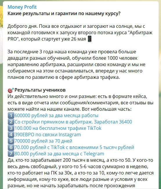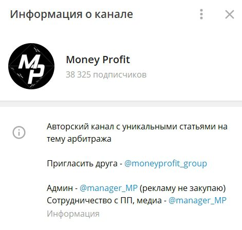 Мани Профит – Телеграм-канал, основным видом деятельности которого является арбитраж трафика. Также авторы проекта предлагают индивидуальное обучение по скайпу с гарантией прибыли от 50 000 рублей каждые 2 недели. Наши специалисты проанализировали проект Money Profit. О том, стоит ли сотрудничать с создателями канала в Телеграме, вы узнаете из нашего обзора.