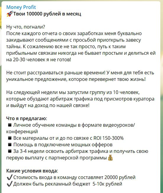 Кроме обучения на Мoney Profit, идет отбор пяти кандидатов в команду. По информации на канале, сотрудничество с новыми участниками будет проходить по следующему формату:- вход в закрытый клуб команды профессионалов – 20 000 рублей;