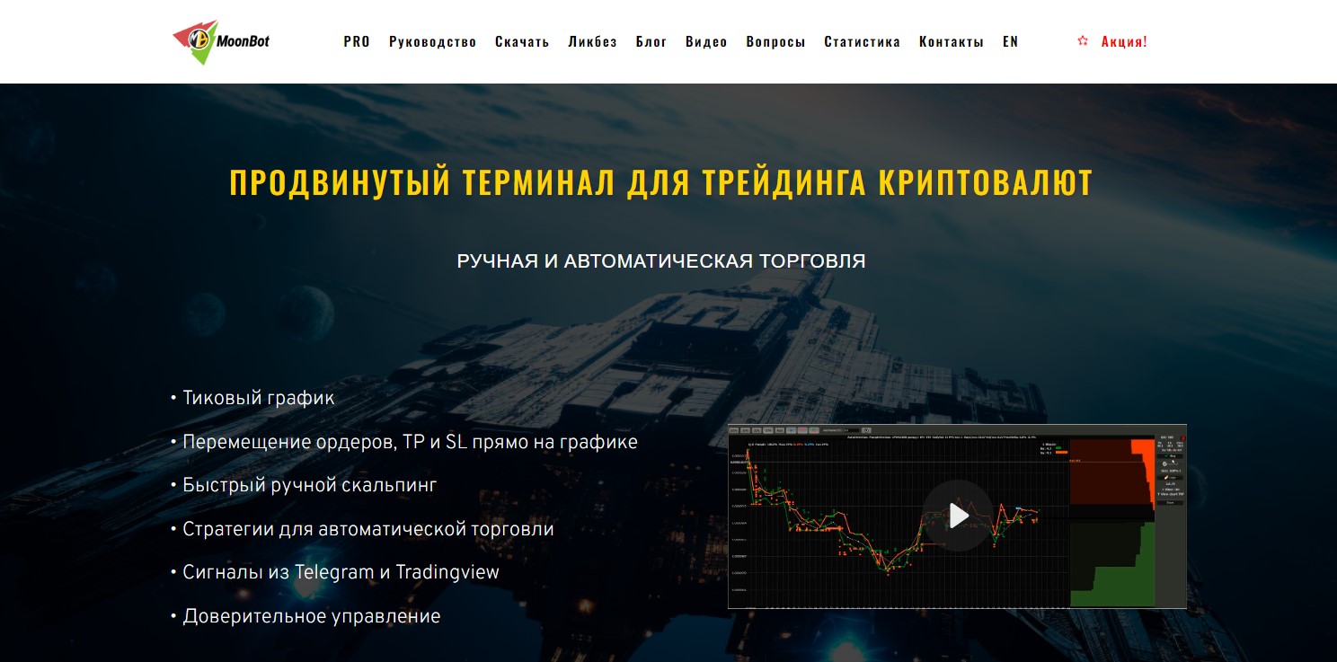 Moon Bot com отзывы о котором мы рассмотрим ниже, — официальный сайт терминала для скальпинга. Создатели Moon Bot обещают возможность сильно упростить торговлю, дав пользователям возможность выставлять ордера в один клик, расширить функционал стандартных терминалов за счет дополнительных метрик и инструментов.