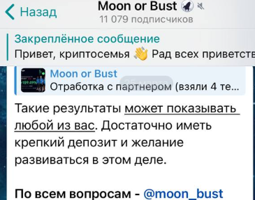 Любой подписчик закрытого канала Moon or Bust может связаться с автором для того, чтобы попасть в группу для торговли. Доступ в группу не бесплатный, трейдер оценивает свои услуги в 300$ и попасть туда можно только заплатив ему эту сумму.